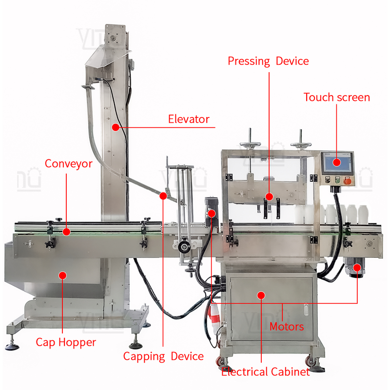 | Sistema de Controle | PLC (Mitsubishi/SIEMENS) + tela sensível ao toque Suporta vários idiomas (inglês, espanhol, alemão, etc.) Armazena mais de 50 receitas de produtos (alternância com um clique entre diferentes tipos de tampas/frascos) |
